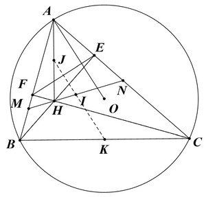 Có \(\angle {MAH} = \angle {NAO} \Rightarrow \angle {IAH} = \angle {IAO} \Rightarrow IJ||AO\) suy ra \(IJ\)trung trực \(EF\)