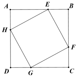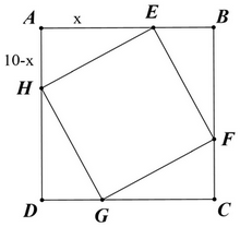 Bác Bình có mảnh vườn hình vuông ABCD có cạnh bằng 10m. Ở bốn góc vườn, bác Bình muốn trồng hoa thành các hình tam giác vuông bằng nhau (hình vẽ). Hãy tính khoảng cách từ góc vườn A đến vị trí E sao cho tứ giác EFGH có chu vi nhỏ nhất.