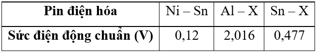 Biết X là một kim loại. Sức điện động chuẩn của pin Al – Ni có giá trị bằng bao nhiêu V? (làm tròn kết quả tới hàng phần trăm)