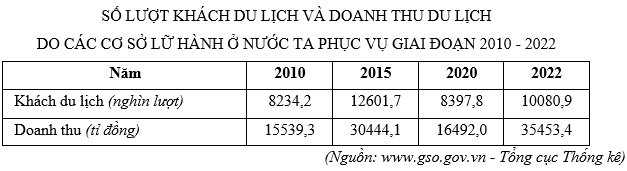 Theo bảng số liệu, để thể hiện số lượt khách du lịch và doanh thu du lịch do các cơ sở lữ hành ở nước ta phục vụ giai đoạn 2010 - 2022, dạng biểu đồ nào sau đây là thích hợp nhất?