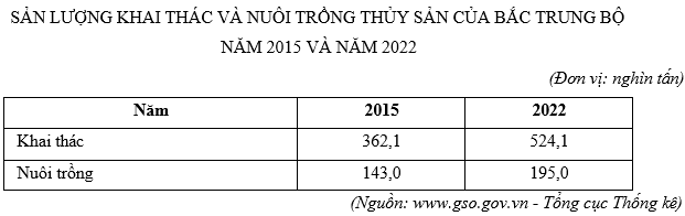 Căn cứ vào bảng số liệu, cho biết chênh lệch sản lượng tăng thêm của khai thác thủy sản so với nuôi trồng thủy sản của Bắc Trung Bộ là bao nhiêu lần? (Làm tròn kết quả đến một chữ số thập phân).