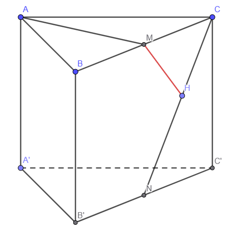Cho lăng trụ đứng $ABC \cdot A'B'C'$ có đáy là tam giác đều cạnh bằng $2\sqrt{3}$, cạnh bên $AA' = 3$. Gọi M, N theo thứ tự là trung điểm của $BC,B'C'$. Tính khoảng cách giữa hai đường thẳng AM và CN.