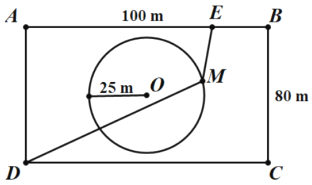 Trên sân vận động, người ta tổ chức một cuộc thi chạy thông minh. Sân vận động là hình chữ nhật ABCD có kích thước $AB = 100~\text{m}$ và $BC = 80~\text{m}$. Ở chính giữa sân người ta vẽ một hình tròn có tâm trùng với tâm của hình chữ nhật, bán kính bằng 25 m như hình vẽ. Lấy E là một vị trí trên cạnh AB sao cho $EB = 20~\text{m}$. Mỗi vận động viên cần xuất phát từ một điểm M trên đường tròn và chạy theo cung đường MDCBEMD. Vận động viên thắng cuộc là người chạy với quãng đường ngắn nhất. Tính độ dài quãng đường ngắn nhất vận động viên phải chạy (đơn vị m , kết quả làm tròn đến hàng đơn vị).