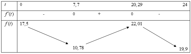 Hằng ngày mực nước của một con sông lên xuống theo thủy triều. Độ sâu $h$ (mét) của mực nước trong sông tính theo thời gian $t$ (giờ) trong một ngày $\left( {0 \leq t \leq 24} \right)$ cho bởi công thức $5\cos\left( {\dfrac{\pi t}{12} + \dfrac{\pi}{3}} \right) + 15$.