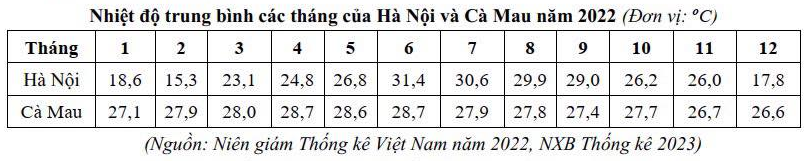 Căn cứ vào bảng số liệu trên, hãy cho biết năm 2022, nhiệt độ trung bình năm của Hà Nội thấp hơn nhiệt độ trung bình năm của Cà Mau bao nhiêu °C (làm tròn kết quả đến một chữ số thập phân).