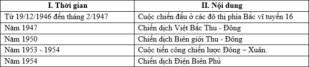 | b) Các chiến dịch quân sự của quân dân Việt Nam trong giai đoạn 1946 - 1954 đều đánh bại âm mưu đánh nhanh thắng nhanh của Pháp. | ||