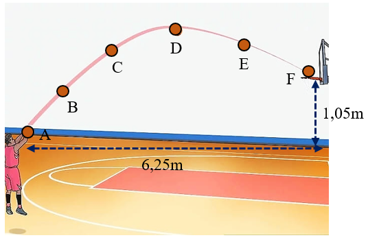 Cú ném bóng rổ 3 điểm được thực hiện tại khu vực cách rổ một khoảng L = 6,25 m. Hình vẽ mô tả vị trí của quả bóng ở các thời điểm khác nhau. Coi rằng quả bóng rổ trong quá trình bay chỉ chịu tác dụng của trọng lực, đường đi của quả bóng có dạng là một phần của parabol. Khối lượng của quả bóng rổ là m = 650 g, A là vị trí ném, F là vị trí bóng rơi vào rổ, D là vị trí bóng lên cao nhất, chọn mốc thế năng tại A, gia tốc rơi tự do là \(g = 9,8m/{s^2}\).