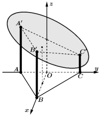 Một mái nhà hình tròn được đặt trên ba cây cột trụ. Các cây cột trụ vuông góc với mặt sàn nhà phẳng và có độ cao lần lượt là 8m, 9m, 10m. Ba chân cột là ba đinh của một tam giác đều trên mặt sàn nhà với cạnh dài 8m. Chọn hệ trục tọa độ như hình vẽ với $B \in Ox$, $C \in Oy$, tia Oz cùng hướng với vectơ $\overset{\rightarrow}{AA^{\prime}}$. Chọn gốc tọa độ $O$ trùng với trung điểm của AC và mỗi đơn vị trên trục có độ dài 1m (xem hình vẽ)