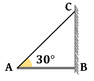 Thanh AB đồng chất tiết diện đều có trọng lượng P, được gắn vào tường tại bản lề B, thanh được giữ nằm ngang cân bằng nhờ dây AC (hình vẽ). Xác định hướng của phản lực do tường tác dụng vào đầu B của thanh.