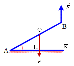Một cần cẩu nâng một trụ bê tông AB đồng chất, tiết diện đều, trọng lượng P lúc đầu nằm yên trên mặt đất. Trong quá trình nâng, đầu A luôn tựa trên mặt đất, lực căng dây \(\overrightarrow F \) luôn thẳng đứng. Tại vị trí trụ bê tông hợp với mặt đất một góc \(\alpha \) thì độ lớn của lực căng dây \(\overrightarrow T \) là