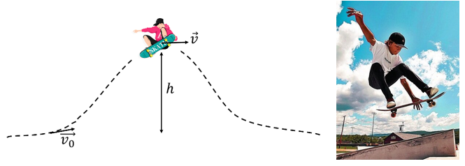 Một người trượt ván thể thao (coi như chất điểm) chuyển động từ sàn phẳng rồi đi lên một mố cong có độ cao h thay đổi được (hình vẽ), độ lớn vận tốc tại chân mố có giá trị \({v_0}\) xác định. Đến điểm cao nhất của mố, người này rời khỏi mố như một chuyển động ném ngang. Thay đổi h đến giá trị h = 2,8 m thì thấy tầm xa của người đó trong chuyển động ném ngang đạt cực đại. Bỏ qua ma sát và sức cản không khí. Lấy \(g = 10\,\,m/{s^2}\). Giá trị của \({v_0}\) gần nhất với giá trị nào sau đây?