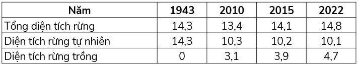 Cho bảng số liệu:Diện tích rừng của nước ta giai đoạn 1943 – 2022(Đơn vị: triệu ha)Nhận