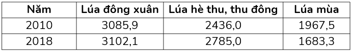 Cho bảng số liệu: Diện tích lúa phân theo mùa vụ của nước ta năm 2010 và năm 2018 (Đơn vị: