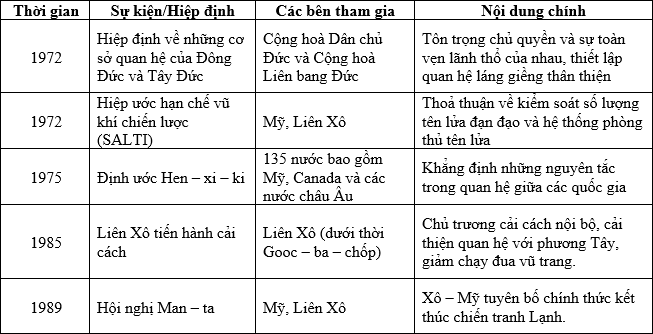 | c) Bảng dữ kiện trên thể hiện được xu thế hòa hoãn đi đến kết thúc Chiến tranh lạnh và sự sụp đổ của hai cực l-an-ta. | ||