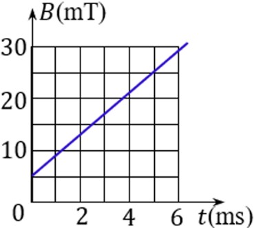 Một khung dây dẫn có 50 vòng, diện tích mỗi vòng 20 cm2 đặt trong từ trường đều của một nam châm điện, mặt phẳng khung vuông góc với các đường sức từ của từ trường. Độ lớn cảm ứng từ của nam châm biến thiên theo thời gian như hình vẽ. Độ lớn suất điện động cảm ứng xuất hiện trong khung là