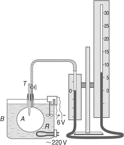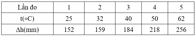 Một nhóm học sinh tiến hành thí nghiệm đo sự phụ thuộc của áp suất khí p vào nhiệt độ tuyệt đối T của một lượng khí xác định. Thí nghiệm được bố trí như hình vẽ: Bình chứa không khí A có thể tích 3,5 lít được đặt trong bình chứa nước B, bình được đậy kín và cắm vào bởi nhiệt kế T và ống dẫn khí có thể tích rất nhỏ so với thể tích của bình, ống dẫn khí được dẫn tới nhánh bên trái của một áp kế thủy ngân (phía trên của nhánh bên phải có lỗ thông với bên ngoài). Nhiệt độ nước trong bình B được nung nóng bởi bếp điện R và áp suất khí được đo bởi hai nhánh chứa thủy ngân hình chữ U. Cho áp suất khí quyển p0 = 760mmHg, khối lượng mol của không khí là 29 g/mol. Thay đổi nhiệt độ nước trong bình B, tiến hành đo nhiệt độ t trên nhiệt kế và chênh lệch độ cao Δh của mực thủy ngân trên hai nhánh chữ U, thu được kết quả theo bảng dưới: