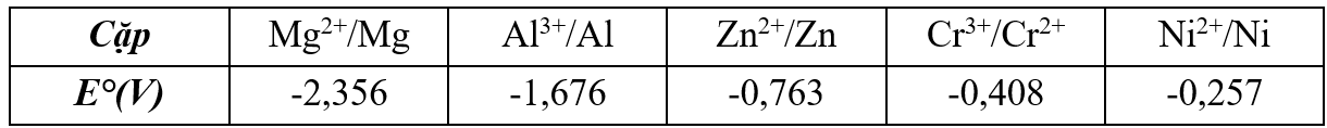 Cho biết giá trị thế điện cực chuẩn (E°) của các cặp oxi hoá - khử sau:Số kim loại trong