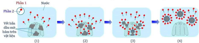(3) Khi xà phòng tan vào nước phần kị nước trong xà phòng thâm nhập vào vết bẩn, phân chia vết bẩn thành những hạt rất nhỏ; phần ưa nước quay ra ngoài, mang theo các vết bẩn phân tán vào nước và bị rửa trôi.