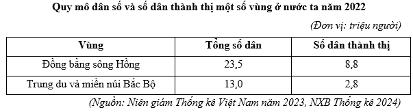 Căn cứ vào bảng số liệu trên, hãy cho biết năm 2022 tỉ lệ dân thành thị của vùng Đồng bằng sông Hồng cao hơn vùng Trung du và miền núi Bắc Bộ bao nhiêu % (làm tròn kết quả đến một chữ số thập phân).