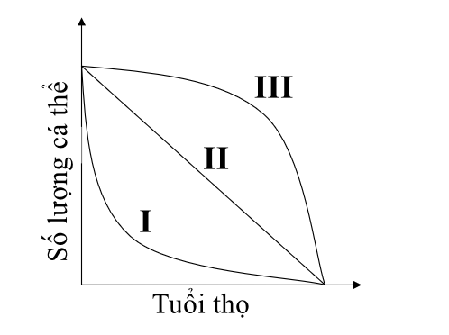Cho đồ thị mức độ sống sót của sinh vật như hình trong đó I, II và III là ba quần thể sinh
