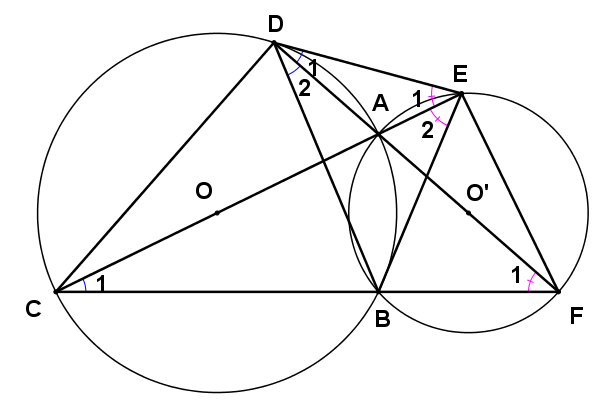 Cho hai đường tròn (O) và (O’) cắt nhau tại hai điểm phân biệt A, B. Đường thẳng AO cắt hai đường tròn (O) và (O’) lần lượt tại hai điểm C, E (khác điểm A). Đường thẳng AO’ cắt đường tròn (O) và (O’) lần lượt tại hai điểm D, F (khác điểm A). Chứng minh: