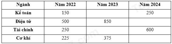 Bảng số liệu dưới đây thể hiện số sinh viên nhập học của một trường đại học. Năm 2024, số sinh viên ngành Điện tử bằng 80% tổng số sinh viên ngành này của 2 năm trước đó, ngành Cơ khí tăng 20% so với năm liền trước.