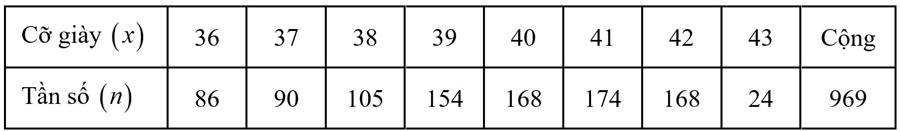 Xác định tần số của cỡ giày số 39 và tổng các tần số.