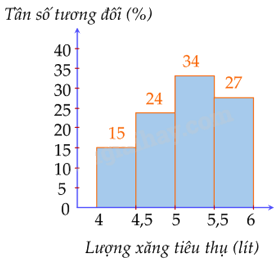Một doanh nghiệp sản xuất xe ô tô khảo sát lượng xăng tiêu thụ trên 100 km của một số loại xe ô tô trên thị trường. Kết quả khảo sát 100 chiếc xe được biểu diễn trong hình dưới đây: