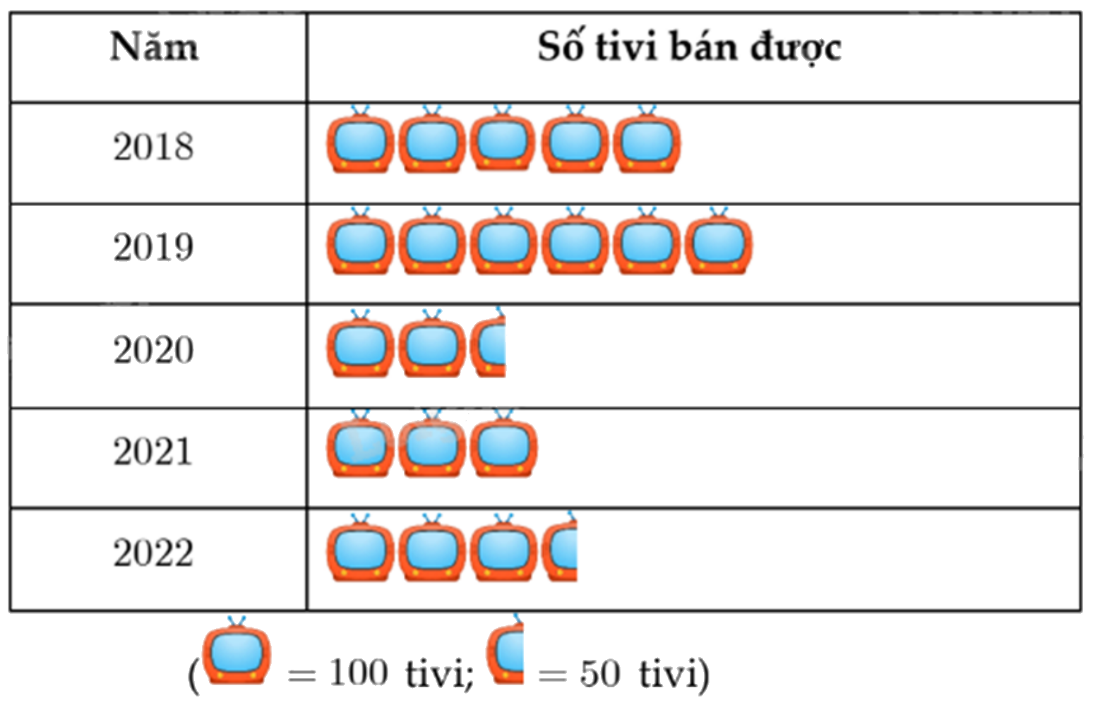 Từ biểu đồ tranh, tính tổng số ti vi bán được từ năm 2018 đến năm 2022 và số ti vi bán được trong năm 2022.