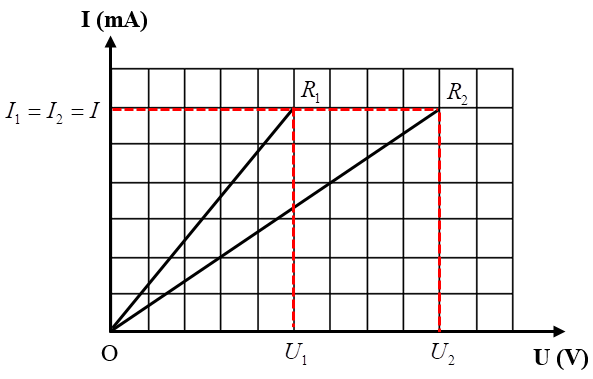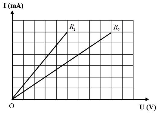 Đường đặc trưng vôn – ampe của điện trở \({R_1}\) và \({R_2}\) có dạng như hình bên. Hệ thức nào sau đây đúng khi so sánh \({R_1}\) với \({R_2}\)?