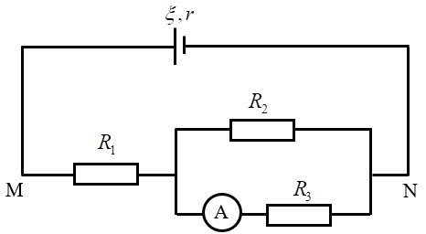Với \({R_1};{R_2} = {R_3}\). Nguồn điện có suất điện động \(\xi = 12V\), điện trở trong \(r = 1\Omega \). Ampe kế có \({R_A} = 0\) và chỉ 1,5 A. Tính hiệu điện thế hai đầu MN.