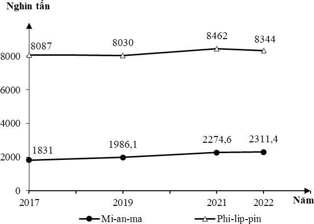 Biểu đồ thể hiện sản lượng ngô của Mi-an-ma và Phi-lip-pin giai đoạn 2017 - 2022