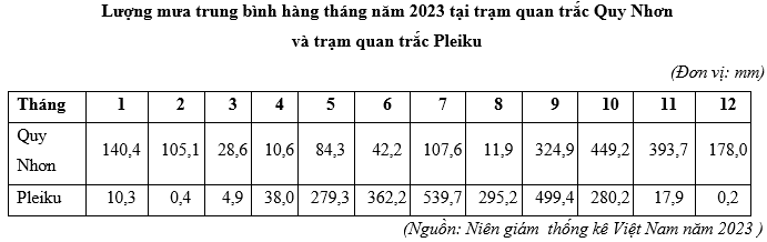 Căn cứ vào bảng số liệu trên, hãy cho biết tổng lượng mưa cả năm của Pleiku lớn hơn tổng lượng mưa cả năm của Quy Nhơn bao nhiêu mm? (làm tròn kết quả đến hàng đơn vị)