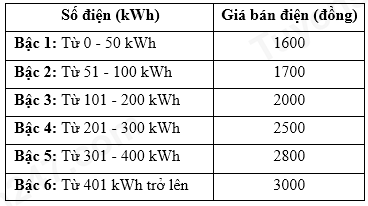 Dưới đây là biểu giá bán lẻ điện sinh hoạt của công ty điện lực X áp dụng cho các hộ gia đình, chưa kể thuế.
