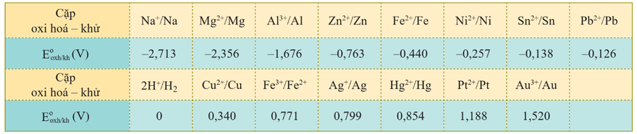 Bảng 1. Bảng giá trị thế điện cực chuẩn của một số cặp oxi hóa – khử của kim loại