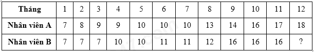 Hai nhân viên bán bảo hiểm đang cạnh tranh nhau giải thưởng "Nhân viên bán hàng có phong độ ổn định nhất năm". Số hợp đồng kí được mỗi tháng của hai người được ghi nhận trong bảng dưới đây. Biết rằng trong tháng cuối, nhân viên A đã hài lòng với kết quả của mình còn nhân viên B vẫn tiếp tục đi tìm thêm khách hàng nên chưa có số liệu.