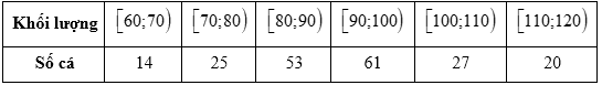 Khối lượng (gam) tăng trưởng của 200 con cá rô phi sau 1 tháng sử dụng cám viên $X$ được các nhà nghiên cứu ghi lại như sau: