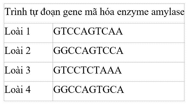 Giả sử trình tự một đoạn DNA thuộc gene mã hóa enzyme amylase được dùng để ước lượng mối quan hệ nguồn gốc giữa các loài. Bảng dưới đây liệt kê trình tự đoạn DNA này của 4 loài khác nhau.