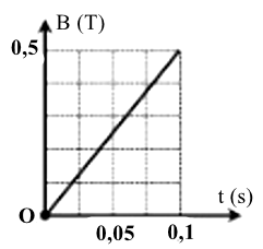 Một vòng dây kín có diện tích 50 dm2 đặt trong từ trường đều sao cho vector cảm ứng từ song song và cùng chiều với vector đơn vị pháp tuyến của mặt phẳng vòng dây. Độ lớn cảm ứng từ biến thiên theo thời gian như đồ thị trong hình vẽ. Độ lớn suất điện động cảm ứng sinh ra trong vòng dây bằng bao nhiêu?