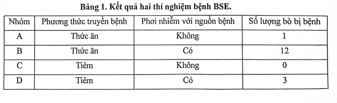 Thí nghiệm 2: Các nhà khoa học tiêm vào hộp sọ của hai nhóm 30 con bò khỏe mạnh não cừu xay. Những con bò nhóm C nhận phần não không bị bệnh và nhóm bò D nhận phần não có bệnh. Sau 18 tháng, hai nhóm bò được đưa vào lò mổ để khám nghiệm mô não để kiểm chứng bệnh bò điên.