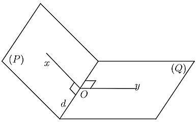 Hình gồm hai nửa mặt phẳng (P) và (Q) có chung bờ d được gọi là một góc nhị diện, kí hiệu [P,d,Q]. Từ một điểm O thuộc d, kẻ các tia Ox, Oy lần lượt thuộc hai nửa mặt phẳng (P) và (Q) và cùng vuông góc với d. Góc xOy được gọi là góc phẳng nhị diện của [P,d,Q]. Số đo của xOy được gọi là số đo của góc [P,d,Q].