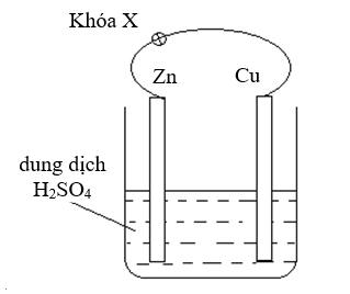 Nhúng thanh kẽm và thanh đồng (không tiếp xúc với nhau) vào cốc đựng dung dịch H2SO4 loãng. Nối thanh kẽm và thanh đồng bằng dây dẫn (có một khóa X) như hình bên.