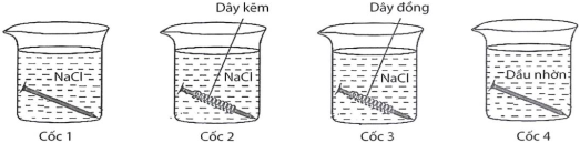 Tiến hành thí nghiệm (như hình vẽ): Rót dung dịch NaCl bão hoà vào cốc 1, cốc 2, cốc 3; cho dầu nhờn vào cốc 4. Cho vào cốc 1 và cốc 4 một đinh sắt sạch, cho vào cốc 2 đinh sắt sạch được quấn bởi dây kẽm, cho vào cốc 3 đinh sắt sạch được quấn bởi dây đồng. Để 4 cốc trong không khí khoảng 5 ngày.