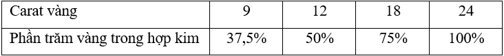 Vàng được sử dụng làm đồ trang sức thường là hợp kim của vàng với các kim loại như silver, copper và zinc. Sự có mặt của các kim loại này làm cho trang sức vàng bền hơn nhiều và vẫn giữ được khả năng sáng bóng. Phần trăm vàng trong hợp kim được đo bằng carat. Tỷ lệ vàng trong các hợp kim vàng khác nhau được tóm tắt trong bảng dưới đây?