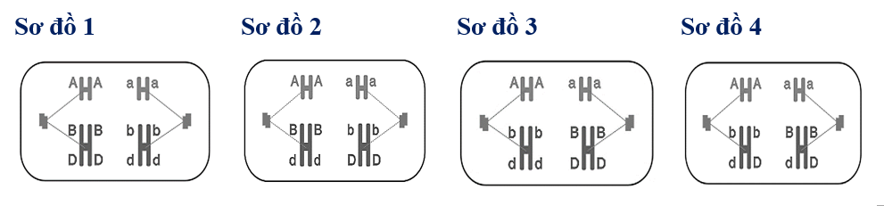 Ở loài đậu thơm, màu sắc hoa do hai cặp gene không allele phân li độc lập chi phối; kiểu gene có mặt hai allele A và B cho cây có hoa màu đỏ, kiểu gene có một trong hai allele A hoặc B, hoặc thiếu cả 2 allele thì cho cây có hoa màu trắng. Tính trạng dạng hoa do một cặp gene quy định, allele D quy định dạng hoa kép trội hoàn toàn so với allele d quy định dạng hoa đơn. Khi cho tự thụ phấn giữa F1 dị hợp 3 cặp gene với nhau, thu được F2 gồm 49,5% cây hoa đỏ, dạng kép: 6,75% cây hoa đỏ, dạng đơn: 25,5% hoa trắng, dạng kép: 18,25% cây hoa trắng, dạng đơn. Các tế bào của cá thể F1 giảm phân bình thường. Viết theo thứ tự từ bé đến lớn các sơ đồ đúng có thể xảy ra khi mô tả về các tế bào này đang ở một giai đoạn của giảm phân?
