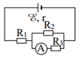 Cho mạch điện có sơ đồ như hình bên. Biết E = 12 V; \({R_1} = 4\,\,\Omega \); \({R_2} = {R_3} = 10\,\,\Omega \). Bỏ qua điện trở của ampe kế và các dây nối. Số chỉ của ampe kế là 0,6 A. Giá trị điện trở trong của nguồn điện là bao nhiêu \(\Omega \)?