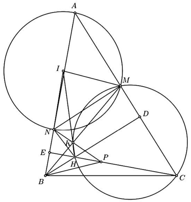 Cho tam giác nhọn $ABC$ có $BC < AB < AC$. Gọi $BD,CE$ là các đường cao, $H$ là trực tâm của tam giác $ABC$. Trên đoạn thẳng $HC$ lấy điểm $P(P$ khác $H$ và $C),M$ là điểm trên cạnh $AC$ sao cho tia $BD$ là phân giác của góc $MBP$. Gọi $N$ là điểm đối xứng với $B$ qua $E$. Đường tròn ngoại tiếp tam giác $MHC$ cắt $BM$ tại $K(K$ khác $M)$.
