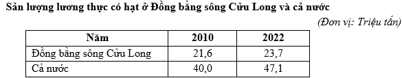 Căn cứ vào bảng số liệu trên, hãy cho biết tỉ trọng sản lượng lương thực có hạt ở Đồng bằng sông Cửu Long trong cả nước năm 2022 so với năm 2010 giảm bao nhiêu phần trăm (làm tròn kết quả đến một chữ số thập phân).