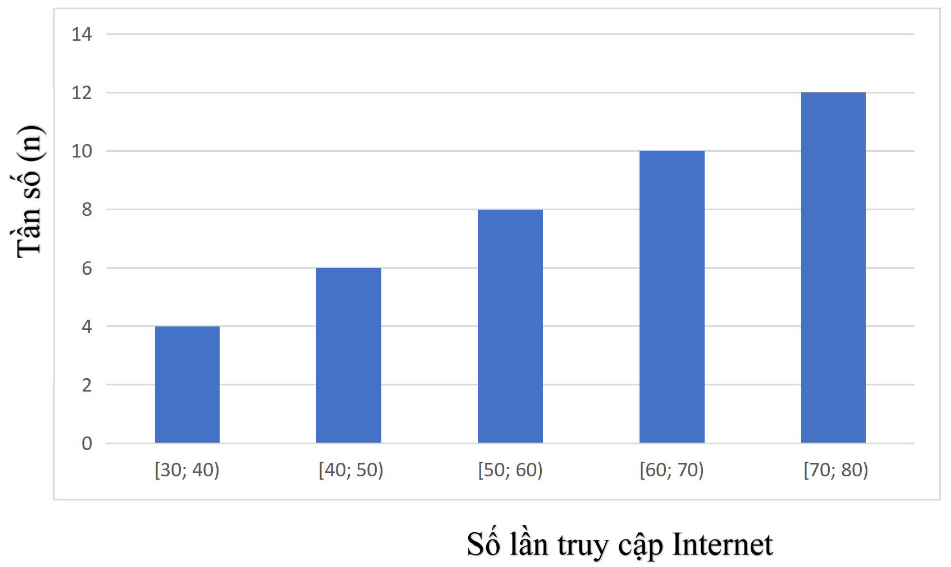 Sau khi điều tra số lần truy cập Internet của 40 người trong vòng 1 tuần (đơn vị: số lần truy cập), người ta có biểu đồ tần số ghép nhóm dưới đây: