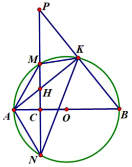 Cho đường tròn tâm O đường kính $AB = 2R$. Gọi C là trung điểm của OA, qua C kẻ dây M N của (O) vuông góc với OA tại C. Gọi K là điểm tùy ỳ trên cung nhỏ BM, H là giao điểm của AK và MN. Tia BK cắt đường thẳng MN tại điểm P.